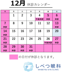 notice-of-closure 2025.10.31 12月及び年末年始の休診について 12/4(木)午後~12/6(土)は院長が学会のため休診となります。 12/26(金)午後~1/3(土)までは年末年始のため休診となります。 その他日曜祝日の他に12/13(土)は休診日です。 ご迷惑をおかけしますが、宜しくお願い致します。 しべつ眼科 facebook Line twitter google