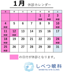 notice-of-closure 2025.12.01 1月の休診について 12/26(金)午後~1/4(日)までは年末年始のため休診となります。 また、日曜祝日の他に1/10(土)、1/24(土)は休診日です。 ご迷惑をおかけしますが、宜しくお願い致します。 しべつ眼科 facebook Line twitter google